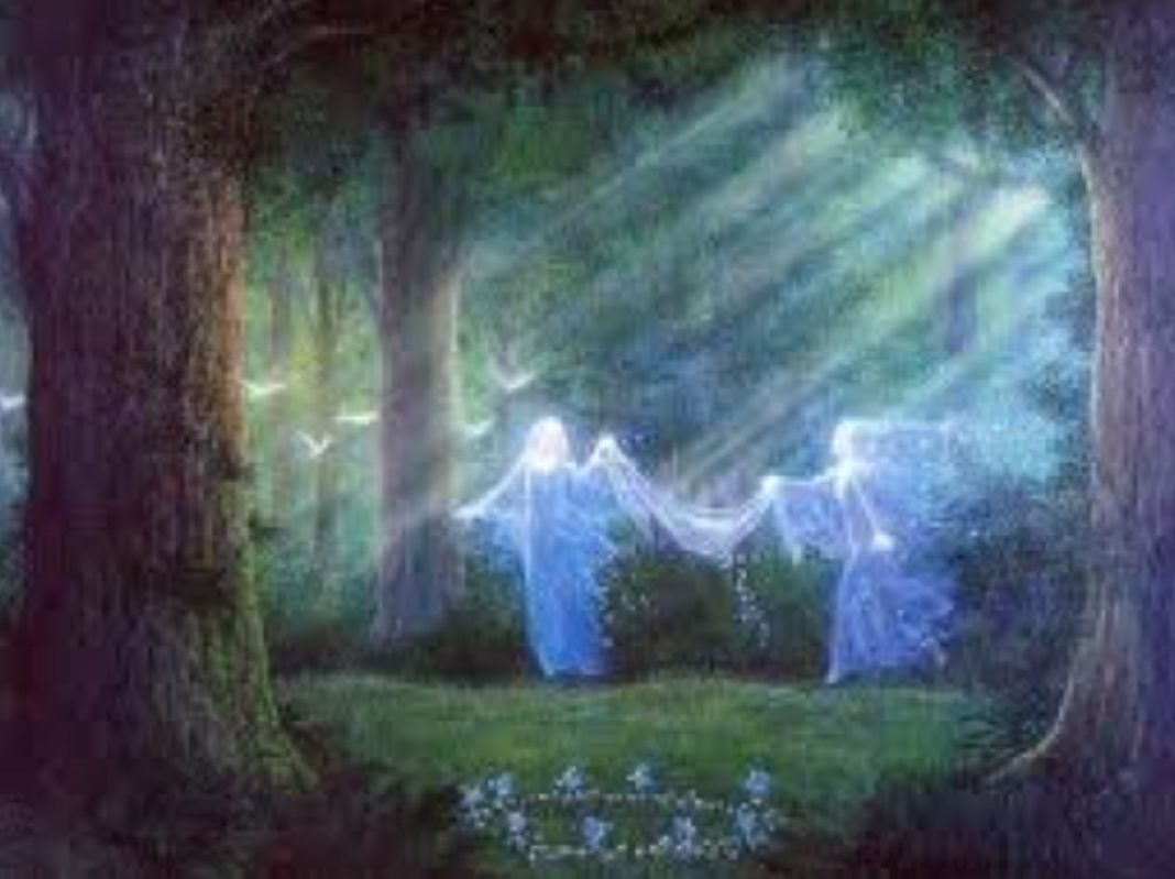 Nous appliquons de l’argile bleue, l’argile sacrée sur notre troisième œil. Une fois ouvert, nous nous voyons entourés par les petites gens, les fées qui dansent et chantent dans une belle expression d’unité et de sérénité. Nous, les Madeleines, vous invitons à introduire cette danse bienheureuse, ce moment d’unité dans l’espace de votre cœur et dans les parties les plus blessées de votre psyché qui ont besoin – un grand besoin – de la lumière de la Mère, et inspiration et expiration de sa Lumière. En tournant et en dansant, vous transmutez la douleur de ces blessures et vous les remplissez d’amour et de lumière.
